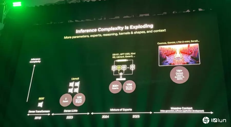 AI模型的复杂性与场景处理的挑战英伟达指出,随着AI推理与模型复杂性呈爆炸式增长,所需的AI核心数量急剧增加。过去处理如Llama 3这类单一密集模型时,可能需要约10,000个不同的AI核心。然而,如今面对HSCR1和GPTO OSS等模型,为了提供高性能,则需要约1,000万个核心。这种复杂性源于模型的规模、大小,以及经常包含数百个专家的混合专家模型。