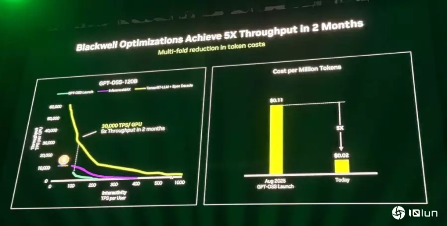 现有架构的突破:GB200成本与性能革命在2025年全球开放运算高峰会上英伟达表示,在现有架构上展现了惊人的性能提升。因为仅在两个月内,英伟达就将B200数据中心对开放源码AI模型GPTO OSS的性能提升了5倍。这一性能上的显著改进,使数据中心提供每百万个token的成本从11美分大幅降至仅2美分。